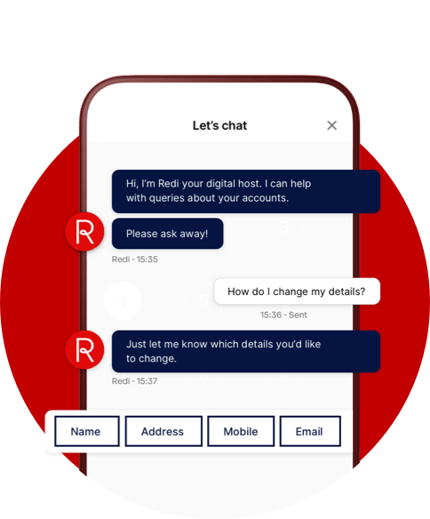 Get 24/7 help from Redi, our digital host. Available in our Credit Card app and Mobile Banking app
